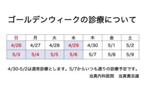 ゴールデンウィークの診療のお知らせ 2026.04.14 今年は暦通りです。4/30-5/2は通常通りの時間で診療いたします。 5/7から通常診療に復帰します。 よろしくお願い申し上げます。 当真貴志雄 お盆休みのお知らせ前の記事